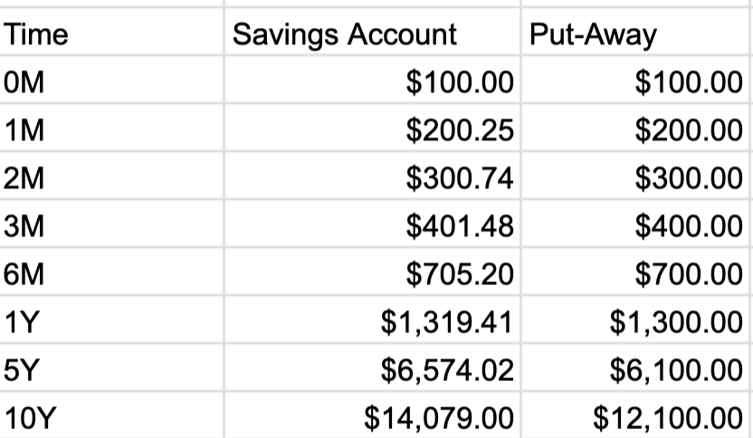 Here's what a side-by-side comparison of putting money into a savings account vs. just putting it away and storing it looks like over time: